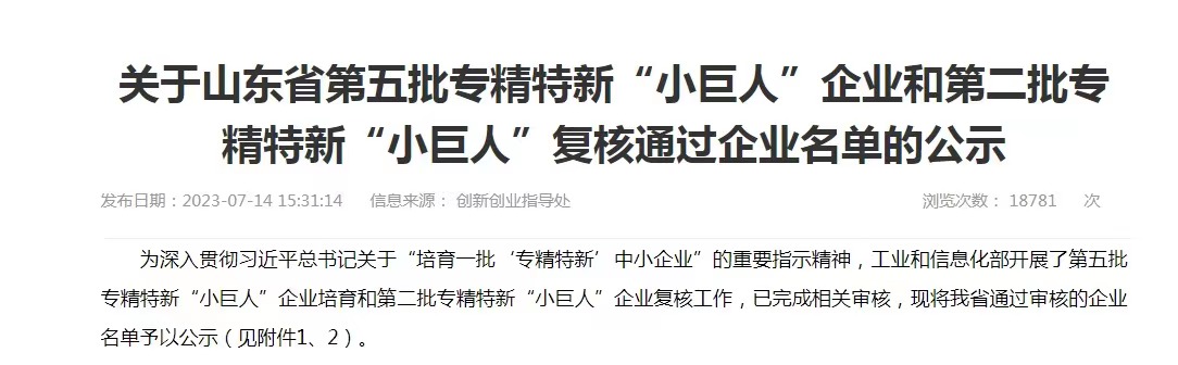 捷报!日照天平生物胜利经由过程第五批专精特新“小伟人”企业考核